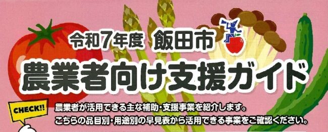 → PDF版のダウンロードはこちらから(全8ページ) 令和7年度 「飯田市 農業者向け支援ガイド」を発行しました。 飯田市の農業に関する補助・支援事業を1冊にまとめた冊子です P2〜P4「各種 補助・支援事…