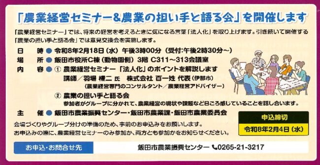 2月18日に「飯田市 農業経営セミナー&農業の担い手と語る会」を開催します お知らせ, 募集情報By 飯田市農業振興センター2025年12月18日 「農業経営セミナー&農業の担い手と語る会」を開催します(要申込) これからの農業経営について考えてみませんか? 今回は、多くの方が気になっている「法人化」について、 講師の羽場先生に分かりやす…